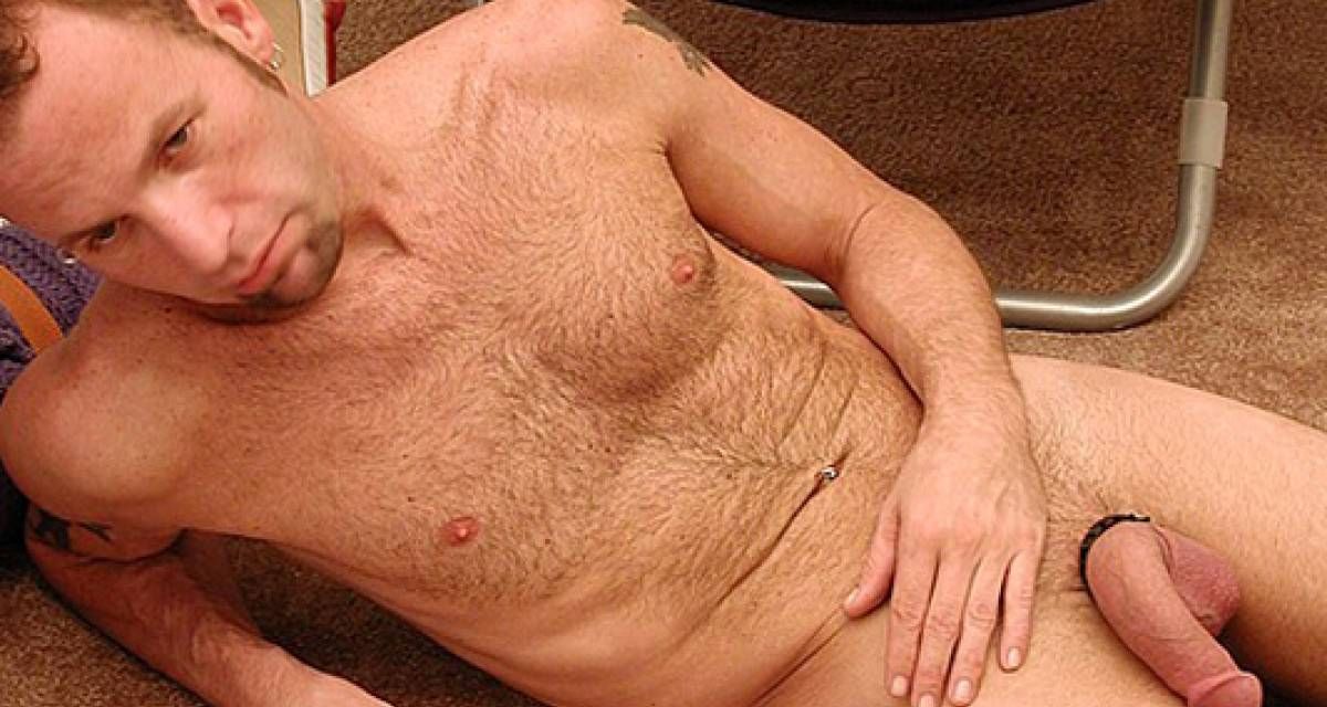 Porn hottie Slater Reed stopped by to give us our own little show. Pierced and tattooed, wearing cammo shorts and a sleeveless tee, Slater puts on a show that gives merit to his hot, bad boy reputation. He rubs himself through his pants, getting his dick hard, and eventually starts to tease us, showing us just the head of that classically shaped dick. Slater leers at the camera, making us unsure if he wanted to fuck it, or punch it.He crawls onto the floor, sheds his boxer briefs and leans over the chair, giving us a glimpse of his tight little butt as he is working his dick. Slater likes the use of his own saliva as lube, and he was definitely not shy about slopping some spit onto his palms and having at it with both fists. He gets so horned up, he rolls over onto his back and finishes off by shooting straight into the air, at first we even thought some had landed on the camera. Slater needed a towel not only for that sticky sweet load, but for all of the sweat that he had mustered jerking. His chest and stomach were drenched, and even the pillow under his head was soaked from his efforts!
